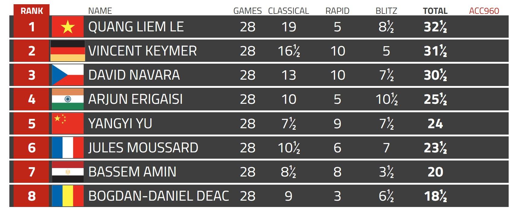 Trước ván cuối nội dung cờ tiêu chuẩn, Lê Quang Liêm mất quyền tự quyết trong cuộc đua vô địch với Vincent Keymer (Đức) bởi kém đối thủ 0,5 điểm. Kỳ thủ số 1 Việt Nam chỉ vô địch khi thắng David Navara (CH Czech) còn Vincent Keymer không thắng được Arjun Erigaisi (Ấn Độ) hoặc hòa David Navara còn Vincent Keymer thua Arjun Erigaisi.